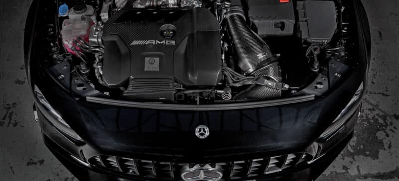 L’admission Mercedes M139 pour l’A45 et la CLA45 a été développée pour permettre au turbo de suivre un parcours plus fluide pour le flux d’air. En repensant le système pour permettre un parcours beaucoup plus direct, le turbo est capable de générer une suralimentation avec moins de traînée et donc d’atteindre la pression de suralimentation cible plus tôt dans la plage de régime. Ce système d’admission a été développé pour offrir le débit le plus élevé possible tout en maintenant les températures d’admission les plus basses possibles pour produire un gain de performances net. Le trajet d’écoulement sans restriction permet également d’entendre plus clairement la bobine du turbo, ce qui ajoute à la dynamique de l’expérience de conduite globale.
