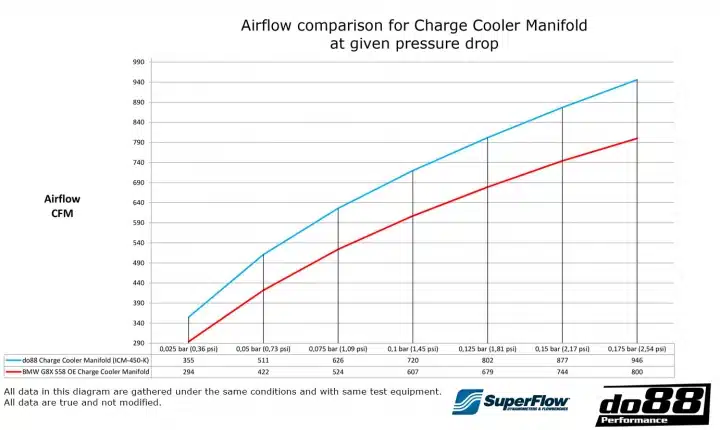 Maintient des températures d’admission d’air basses et montre une amélioration par rapport au refroidisseur de charge d’origine. 28,5°C par rapport à OEM 33°C. Les chiffres exacts sont disponibles dans les diagrammes sous les images du produit.