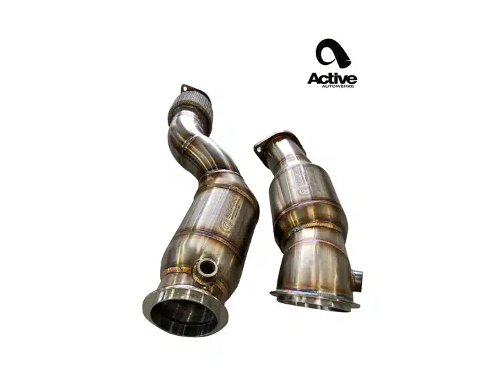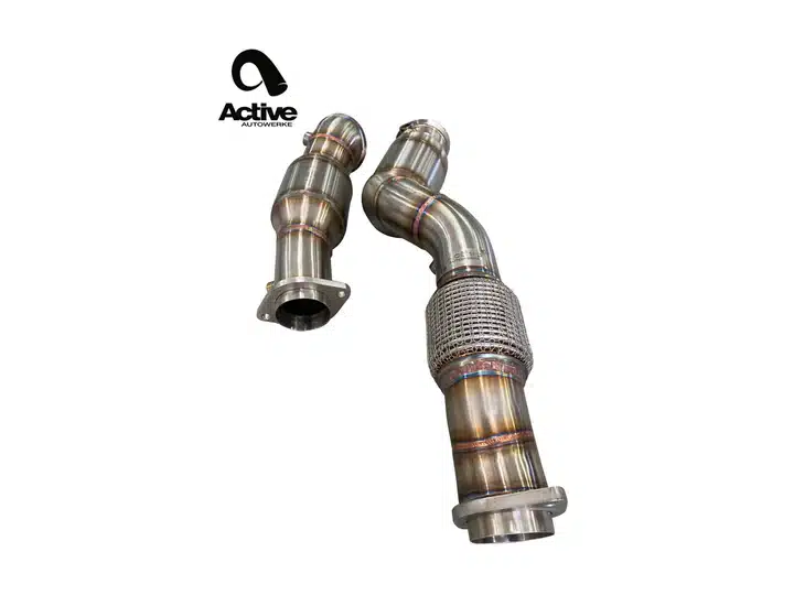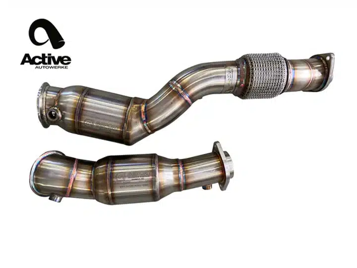 Les turbocompresseurs sont alimentés par les gaz d’échappement produits lors de la combustion. Plus ces gaz sont évacués rapidement, mieux c’est. Malheureusement, le tuyau de descente d’origine de la S58 est un peu restrictif, ce qui ralentit le débit des gaz d’échappement et le fonctionnement du turbo. Pour la première étape de la gamme Active Autowerke G8X M3/M4/M2, nous lançons notre tuyau de descente catalysé signature.