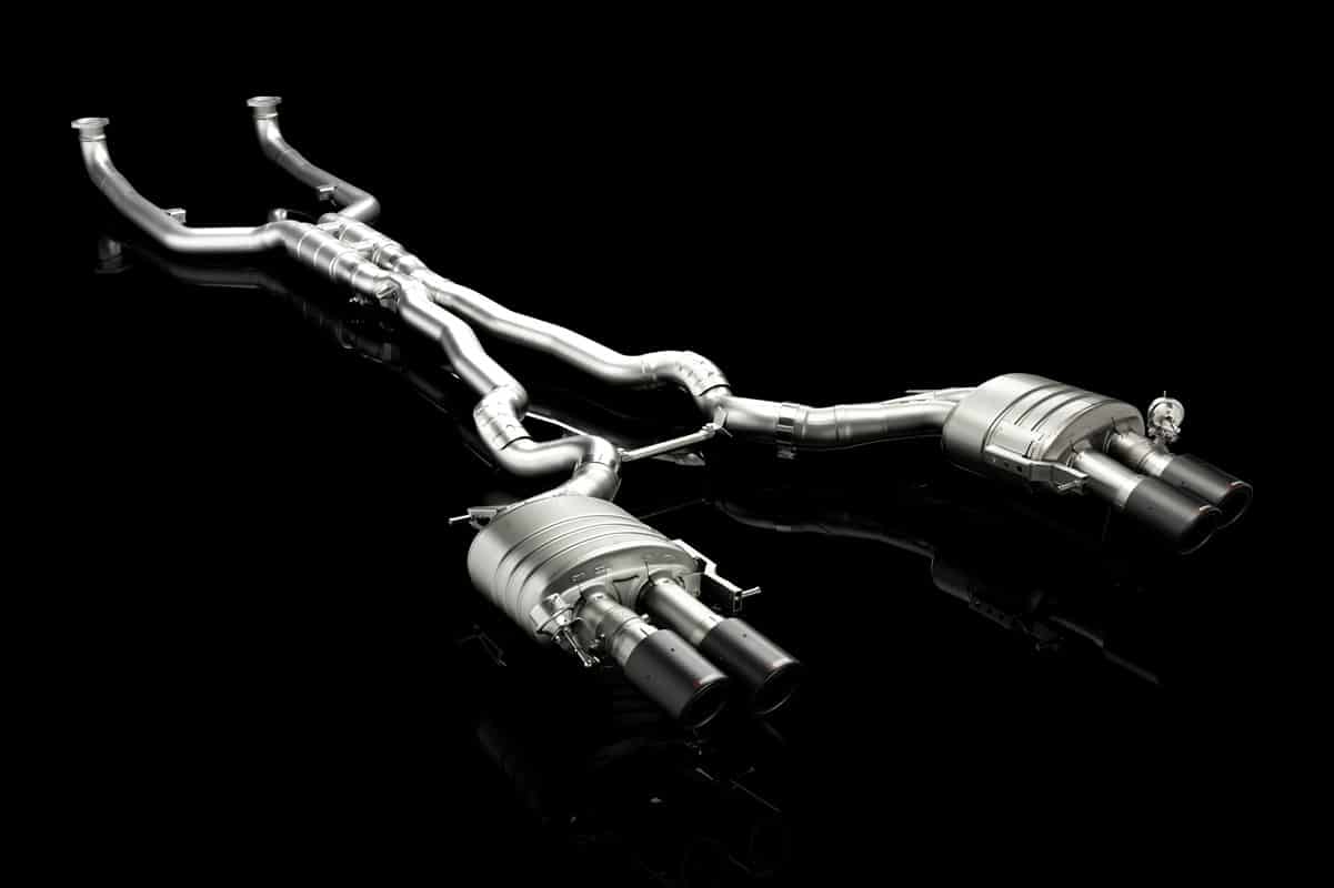 Le système d’échappement Evolution en titane exclusif se compose de silencieux à double sortie nouvellement développés avec soupapes d’échappement, de tuyaux à flux optimisé et d’une pièce unique en titane moulé en forme de X avec résonateurs. La contre-pression est abaissée et la M6 bénéficie de plus de puissance sur toute la plage de régime. Il augmente la réactivité et un meilleur rapport puissance/poids a été obtenu sans retirer les convertisseurs catalytiques. L’ échappement de performance Evolution offre un son sportif profond, qui se transforme en rugissement agressif lors d’une conduite intense, mais sans bourdonnement. Il fonctionne bien avec le système ANC de la M6 – tout comme le système de soupapes, qui est régulé via les réglages de la M6. Complétez le look avec un ensemble de quatre sorties d’échappement exquises en titane ou en fibre de carbone , référence TP-CT/10 (carbone) ou TP-T/S/5 (Titane)