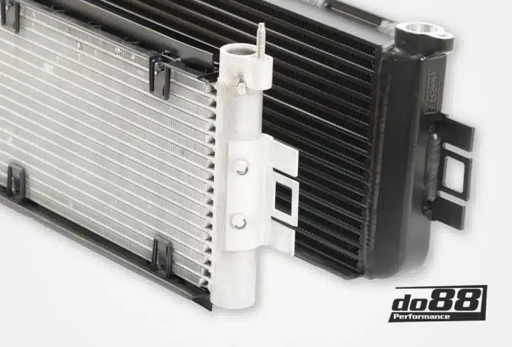 Le moteur S58 des modèles BMW G8X M2/M3/M4 2021+ comporte un Radiateur d’huile moteur qui est monté horizontalement sous les radiateurs centraux avant. Le radiateur d’huile original a un noyau Tube & Finn, qui peut facilement être endommagé par des cailloux ou autres débris routiers. En raison de sa conception et de son emplacement, il n’est pas rare que le radiateur d’huile commence à fuir en raison de dommages causés par de petits cailloux ou autres débris routiers. De telles fuites d’huile peuvent endommager gravement le moteur. Avec notre radiateur d’huile moteur do88, nous offrons une conception beaucoup plus durable et bien sûr en même temps améliorons la performance de refroidissement !